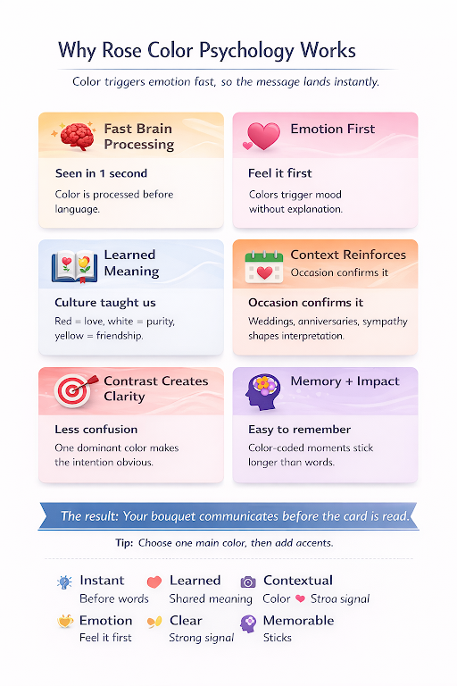 Color psychology works because colors instantly influence how we think, feel, and act. Each shade carries emotional triggers that shape perception, trust, and decision-making. So, if you have ever wondered if color in roses is a gimmick, well, this infographic explains why it’s not: